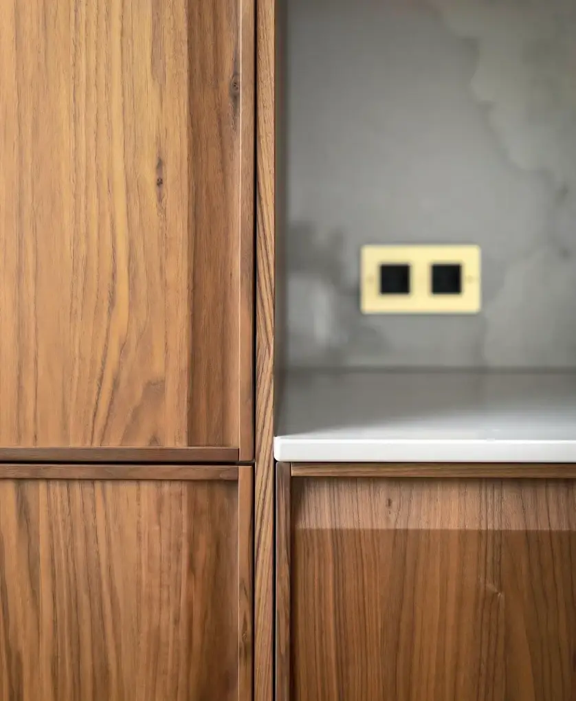 • Cuisine sur-mesure : îlot central, portes sans poignées, matériaux nobles comme le bois naturel et le plan Dekton.