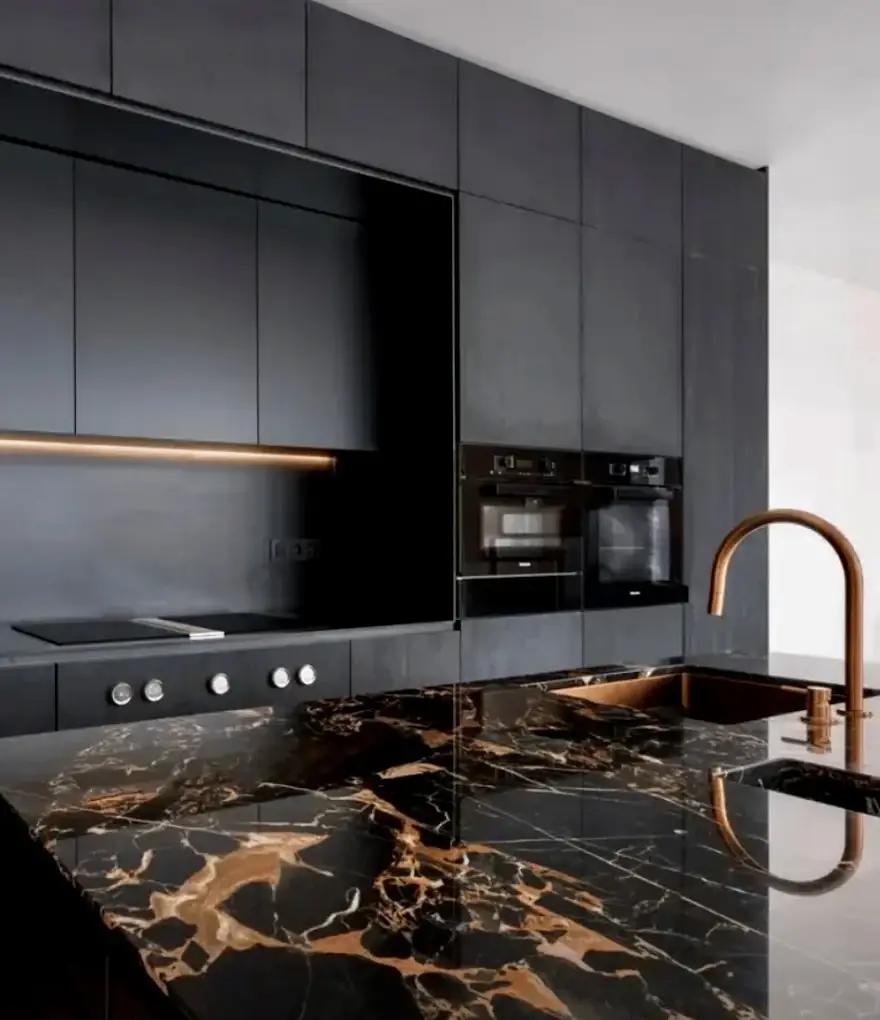 Cuisine moderne en bois et façade en FENIX noir avec des finitions élégantes à Biarritz